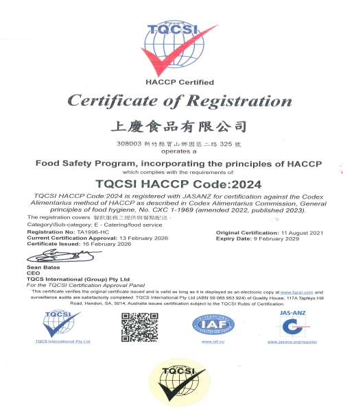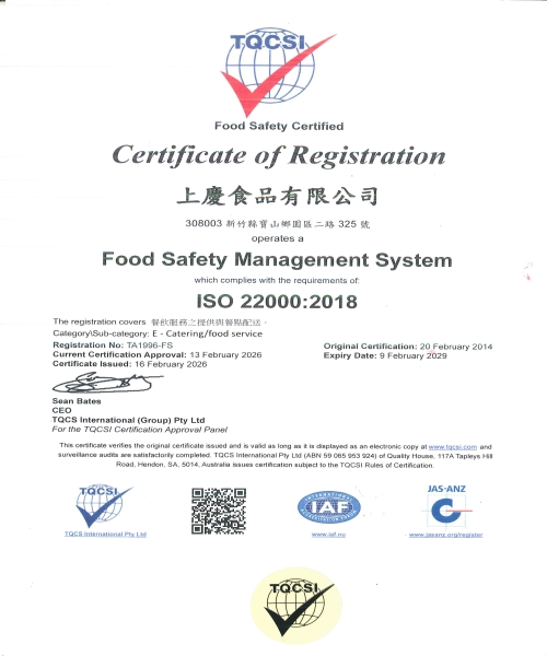 各項認證及檢驗報告各項 新竹市政府營利事業登記證 營業登記變更 新竹縣政府廢棄物清除許可證 牛肉檢驗報告 米的檢驗報告 冷凍雞腿的檢驗報告 豬肉證明書 產品責任險 營養師證照 ISO 22000:2018 TQCSI HACCP Code:2024